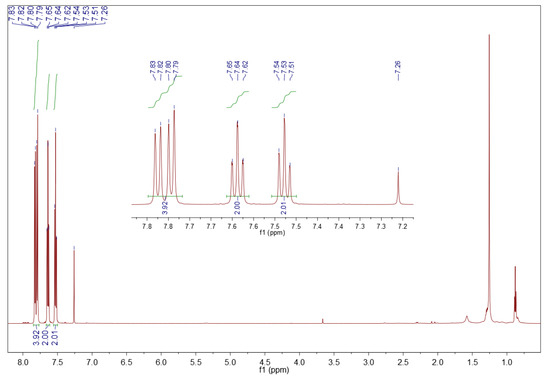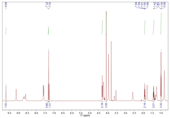The 1H NMR spectrum of the purchased [BMIM][HSO4] is depicted in Figure 5 [45]. Since its purity is ≥95%, some traces of impurities appear. The peaks corresponding to [BMIM][HSO4] are shown below.