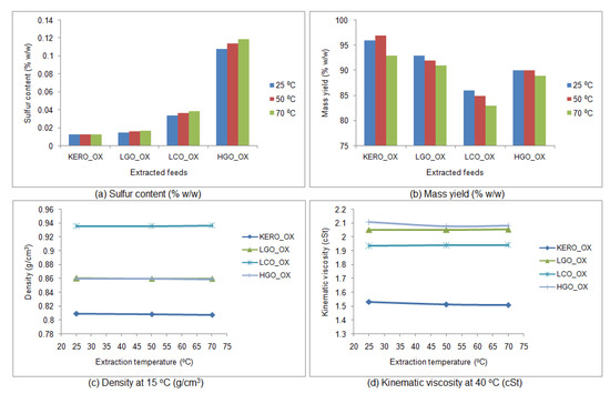 Primary tests were conducted at three different temperatures, i.e., at an ambient temperature of approximately 25 °C, at 50 and at 70 °C, in order to ascertain the desulfurization capability of [BMIM][Br] and [BMIM][HSO4]. The two fresh ionic liquids were tested for each oxidized surrogate blend. In a conical flask, 10 g of each oxidized surrogate feed was added and the respective amount of each ionic liquid was weighed at a mass ratio of 1.0:1.0. The two-phased mixtures were stirred continuously at 400 rpm for 30 min, and then placed in separation funnels to settle overnight. The two phases were separated and their weights were measured. Subsequently, the upper phases corresponding to the extracted surrogate products were analyzed for their sulfur content and their physical properties (kinematic viscosity and density).