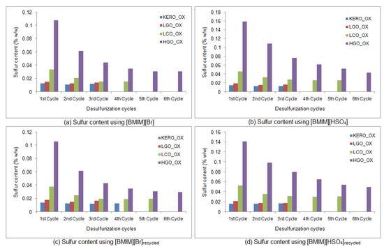 Desulfurization capability of the two fresh and the two recycled ionic liquids. Sulfur content (% w/w) of the surrogate raffinates during the extractions using: (a) [BMIM][Br], (b) [BMIM][HSO4], (c) recycled [BMIM][Br], (d) recycled [BMIM][HSO4]. (KERO_ OX: oxidized surrogate kerosene, LGO_OX: oxidized surrogate LGO, LCO_OX: oxidized surrogate LCO, HGO_OX: oxidized surrogate HGO).