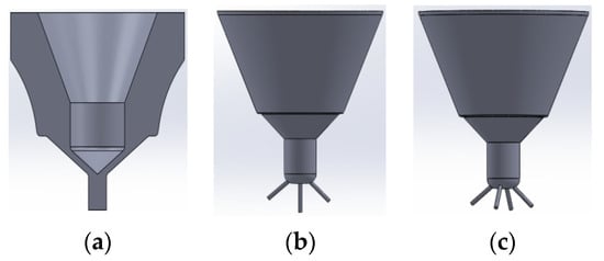 A diagram of fluid in nozzles: (a) single hole, (b) 3-holes, (c) 4-holes.