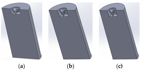 A 1-, 3-, and 4-hole diesel fuel injector with a nozzle angle of 150° was chosen based on their measurements (for 3 and 4 holes). To minimize computation time, only a single nozzle from the uniformly dispersed injector was modeled out of the three-hole and four-hole nozzles. The fluid flow domain inside the nozzle is depicted in Figure 2, and the primary difference between the models is their dimensions, which are based on the nozzles’ technical specifications. The spray domain model was used in this investigation, and half of the model was chosen for all simulations to save computing time. The spray domain of the nozzles was modeled at the upper center of the domain in Figure 3, and the difference between the models was the nozzle specification.