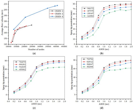 For the tested nozzles, five sets of meshes with different refinement levels were established in this study; the number of elements in each set was 133416, 205940, 345269, 392647, and 408662 (for INHN-1), 125345, 141006, 158186, 202844, and 245541 (for INHN-3), and 116985, 133908, 140095, 170946, and 211568 (for INHN-4) The velocity of the nozzle exit was used as one of the major characteristics in the numerical simulation of the inner flow of the nozzle, and the velocity parameters were estimated using five different meshes. The flow velocity increased consistently with mesh refinement, as shown in Figure 4a. The flow velocity increases dramatically as the number of pieces increases. The flow velocity tends to be stable when the number of nodes reaches its maximum. The Grid Convergence Index (GCI) of the nozzle with 408662 (for INHN-1), 245541 (for INHN-3), and 202844 (for INHN-4) elements is 2.97%, 1.72%, and 1.24%, respectively, using the GCI method to estimate mesh discrete error. Similarly, spray tip penetration was used as a characteristic parameter in the fuel spray simulation. When the element number of the spray domain is 560172, 704079, and 730792 for INHN-1, INHN-3, and INHN-4, respectively, the computed GCI was 2.64%, 2.29%, and 1.58%, which may match the mesh convergence criterion as shown in Figure 4b–d.