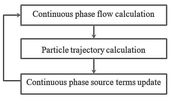 The discrete particle model (DPM) was utilized to capture the flow of vapor formation and atomization throughout the spray development simulation. To compute the continuous phase, the Navier–Stokes equations and the continuity equation were solved, while the force balance on the particle was integrated into the solver to determine particle trajectories. The particle trajectories were estimated using the result of the continuous flow for two-way interaction, whereas the continuous phase was determined using the Eulerian model [10,15]. Figure 6 depicts the two-way connection of the process scheme.