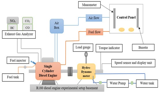 A single-cylinder, 4-stroke DI-CI engine rated at 5.67 kW powers the experimental test setup. A hydraulic dynamometer serves as a loading system, as well as a fuel supply system, water-cooling, lubrication, and exhaust emissions. Figure 7 depicts a schematic illustration of the experimental setup. The setup allows for the evaluation of diesel engine performance metrics and exhaust elements. BP, BSFC, and BTE are some of the engine performance measures. A test engine’s technical specifications are shown in Table 3. An FGA-4100 automobile emission analyzer is used to measure the levels of engine exhaust emissions. During each run of the engine, the CO and CO2 emissions were monitored in percentage volume (% vol), whereas the HC and NOx emissions were measured in parts per million (ppm).