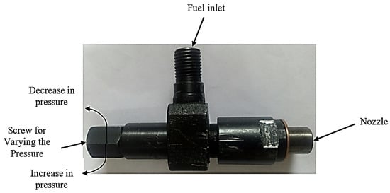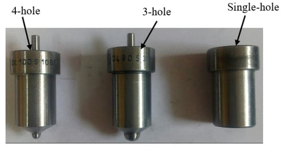 The experimental analysis was carried out on the following three distinct types of injector nozzle hole numbers: 1-hole 0.84 mm, 3-hole 0.33 mm, and 4-hole 0.25 mm, all of which were fueled with WCO biodiesel fuel blends. The technical specifications of injector nozzles used in this study is tabulated in Table 5. The experiments were carried out using the following engine operating parameters of a fixed compression ratio of 21:1 with 23° bTDC fuel injection timing under varying nozzle opening pressure of 190, 200, 210 and 220 bar, respectively. During executing the experiment, the fuel injection pressure was varied by altering the injector spring tension (Figure 8). The photographic view of the nozzles used is shown in Figure 9. The engine was run at various loads to produce the best operating load state for performance and emissions testing, including no-load, 20%, 40%, 60%, 80%, and 100% load. Sufficient attention was given to load the engine precisely at each phase of load and to sustain ambient conditions constant, in which each test was cross-checked on different days. In each of the sets of experiment, the readings of the fuel flow, CO, CO2, NOx, and HC emissions were noted. In which the fuel flow rate and air flow rate were recorded using a fuel burette and a u-tube manometer, respectively, and the various emissions concentrations, such as CO, HC, CO2, and NOx emissions, were also measured using an exhaust gas analyzer. While the performance parameters of BP, BSFC, and BTE were calculated using Equation (2) based on [18]. In the end, the diesel engine performance and emission parameters were plotted against varying engine load and then varying INHNs and fuel IPs, respectively. In the test matrix, Table 6 displays the details of the experiment.