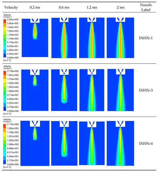 Spray domain model contour velocity for INHN-1, INHN-3 and INHN-4.