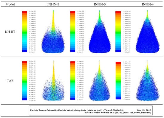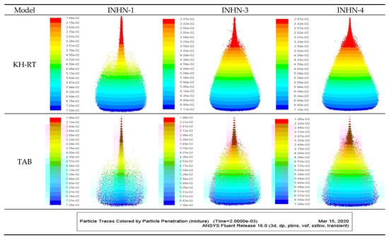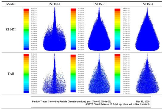 The ratio of the drop volume to its surface area is the particle mean diameter [19,20]. By gradually reducing the droplet size difference while increasing INHNs and decreasing the particle mean diameter, consistent particle size distribution was achieved (Figure 13). Further experimental tests of the various injector nozzles based on varied injection pressures are required, as mentioned in all of the simulation work findings.