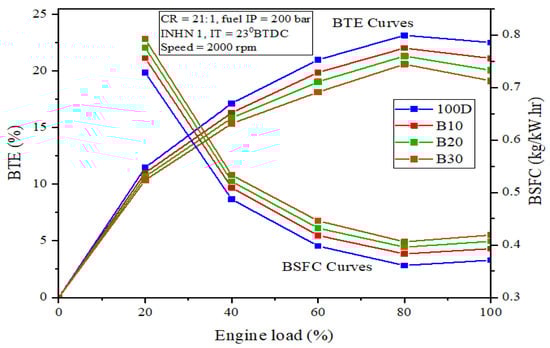 Figure 14 illustrates that the brake thermal efficiency (BTE) and brake-specific fuel consumption have opposing trends (BSFC). It depicts the impact of engine load on BTE and BSFC. The trials were conducted in order to determine the optimal load size that would provide the best fuel economy and efficiency. The BTE increases with engine load but reduces significantly between 80 and 100% loads, as can be seen. This modest decrease could be attributed to a low extra air ratio at high engine loads, which harmed combustion [4]. In this situation, INHN-1, the BSFC, is reduced greatly, and the BTE is boosted to its maximum at an 80% load. The optimum load will be employed for the subsequent execution of the impacts of adjusting the fuel IPs and INHNs based on the outcome of the 80% load condition.