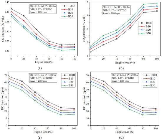 Influence of engine load on (a) CO; (b) CO2; (c) HC; (d) NOx emissions from engine.