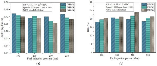 Figure 16a depicts the influence of INHNs and fuel IPs on BSFC in an ideal load situation. The goal of the tests was to find the best injector nozzle number of holes and fuel injection pressure for optimal fuel economy. Because of the starved atomization, the BSFC increases as the nozzle hole diameter (NHD) increases. Figure 16a shows that for a fuel IP of 200 bar, the values of BSFC for INHN-1 are lower than for 190 bar, 210 bar, and 220 bar. Higher BSFC values have come by increasing the fuel IP beyond 200 bar. This could be because increasing the injection pressure reduces the size of the fuel droplets while also increasing their momentum. As a result, excessively large increases in pressure would have produced even smaller droplets, but the droplets’ motion would have caused them to impact the cylinder’s inner wall, resulting in increased fuel consumption to provide the same power. Because of greater rates of air–fuel mixing in INHN-3 and INHN-4, the BSFC decreases dramatically with increasing fuel IP until 210 bar. This indicates that a smaller diameter nozzle necessitates a higher injection pressure in order to achieve complete combustion and reduce fuel usage. As a result, in the current conditions, a fuel IP of 210 bar resulted in a reduced BSFC. It can be shown that the BSFC with INHN-3 and INHN-4 and a fuel IP of 210 bar has the lowest values; thus, it can be concluded from these studies that INHN-4 and a fuel IP of 210 bar yield lower values. Figure 16a depicts the impacts of fuel INHNs on the BSFC of WCO biodiesel (B30) blend fuel for various IPs at 80% operational load. At 210 bar fuel IP, the results reveal that BSFC dropped as INHN increased from one to three and four INHNs. This is due to the increased number of holes, which improved fuel atomization and increased the fine droplets of injected diesel. At INHN-4, the average drop in BSFC of diesel test fuel was 5.62% compared to INHN-3, for fuel IP of 210 bar. However, as compared to the initial fuel IP of 200 bar, the 210 bar fuel IP for all INHNs resulted in a drop.