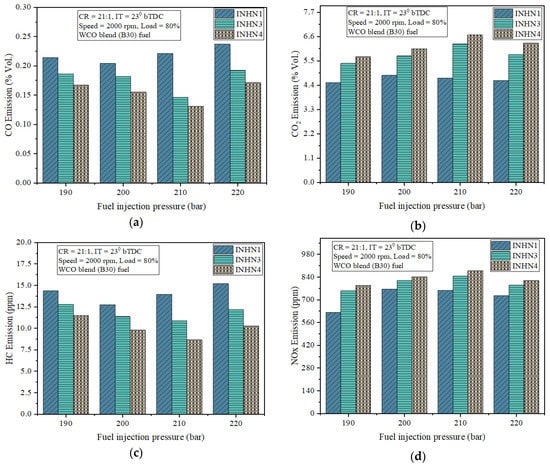 Figure 17b shows the influence of INHNs and fuel IPs on CO2 emissions at an ideal load situation for WCO biodiesel (B30) blend fuel. CO2 emissions, as we all know, are the result of incomplete combustion caused by a rich air–fuel mixture. Furthermore, it was discovered that as INHNs and fuel IPs grew, CO2 emissions increased. This has the added benefit of allowing the fuel IP to be increased up to a specific limit. CO2 emissions are reduced at fuel IP 220 bar and INHN-4, owing to better atomization and appropriate combustion. Using the standard INHN-1, increasing the fuel IP to 210 bar increases CO2 emissions from diesel fuel. The CO2 emission increased by 6.16% at fuel IP 210 bar, and by 4.75% at 220 bar, compared to 200 bar fuel IP and INHN-4 lowered the proportion of CO2 emission at standard conditions due to incorrect combustion [4]. CO2 emissions increased as INHN was raised, according to the findings. As a result, fuel atomization increases, resulting in more carbon being burned and more CO2 emissions. When compared to the optimal working fuel IP of 210 bar utilizing INHN-3, CO2 emissions from diesel fuel increased by 4.23% at INHN-4 but decreased by 11.46% at INHN-1.