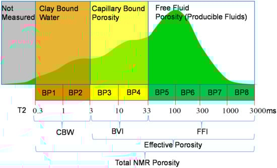 where BP = bin porosity; CBW = clay bound water; BVI = bulk volume irreducible; FFI = free fluid index; = effective porosity; = total porosity; and = irreducible water saturation.