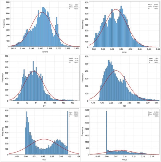 The well logs used in this study as MRA inputs are density (RHOB, g/cc), Neutron (NPHI, v/v), Photoelectric (PEF, b/e), resistivity (deep, shallow, and very shallow, ohm-m), and sonic (DT, us/ft). Instead of gamma-ray (GR), the volume of shale (Vsh, v/v) was used since GR may vary from well to well for the same formation. Effective porosity calculated from the density tool (PHIDe, v/v) was also included to increase MRA accuracy. Table 2 provides a brief explanation for each well log used for this study. Figure 2 shows the variation of well logs inputs.
