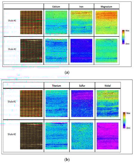 Figure 4a–c display Ca, Fe, Mg, Ti, S, Ni, K, and O for the two shale samples. The maximum intensity for each element differs, but the two shale samples are normalized to each other for the purposes of direct comparison. For both shale samples, the elemental maps correlate nicely to the digital image of the shale area analyzed. The most significant differences between shale sample 1 and shale sample 2 are seen for S, Fe, Ni, and O by visual comparisons. The other elements (Ca, Ti, Al, S, K, and Mg) show subtle differences between the shale samples.