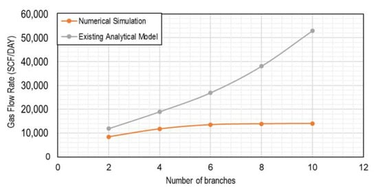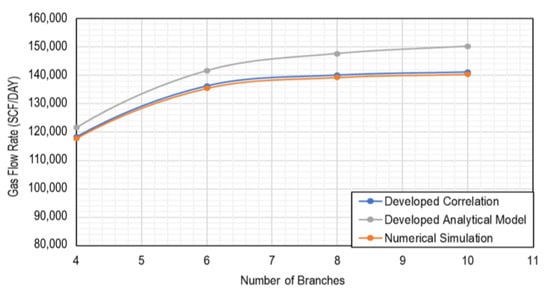 The results show that the flow rate increases with the increase in the number of branches. The trend and the results between the numerical simulation and the modified correlation are similar, with a relatively small difference compared to the modified analytical model (see Figure 12). The augmentation of the number of branches increases the exposed area of the reservoir to enhance production.