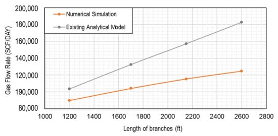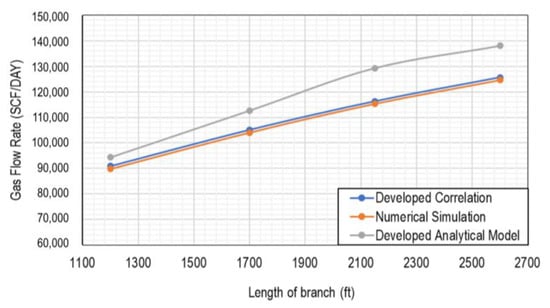The results show that with the length of branches increasing, the flow rate increases in the numerical simulation, the modified correlation, and the analytical model, with a slight difference between them but nearly the same slope as shown in Figure 13. The reason for the production increase is the fact that a large portion of the reservoir has been exposed to the wellbores due to the length increase of the open hole branches, which aligns with the extended-reach drilling technology, with the idea to push the horizontal length to maximize reservoir drainage and minimize water production [55].