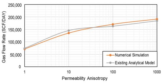 In this study, we evaluated several scenarios where the length of the branches was fixed at 3100 feet, the inter-branch distance was maintained at 2600 feet, and the number of branches was held constant at 6, while varying the permeability anisotropy. The results displayed in Figure 4 indicate a correlation between increased reservoir anisotropy and enhanced well productivity. The outputs from both the existing analytical models and the numerical simulations are highly congruent, with a common value at the intersection between the two models represented by a permeability anisotropy Iani of 40–50.