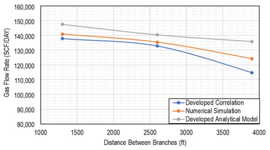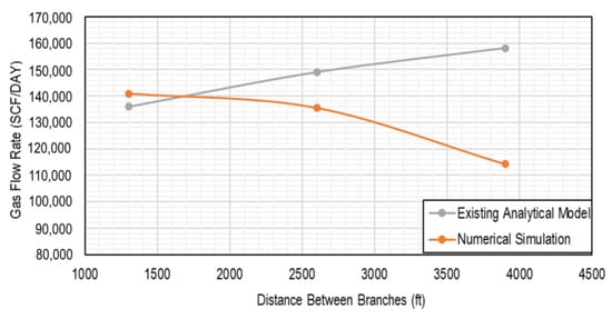 When the distance increases between the branches, the stimulated reservoir decreases, and the flow rate decreases slightly (see Figure 15). The numerical outputs show the same results as the developed correlation, with a constant difference compared to the developed analytical model. The three models confirm a similar trend of productivity decrease as a function of the distance. This validates the effect of the neighboring branches on each other based on the spacing between them, in the case where the distance is above the drainage radius. The results also demonstrate that the severity of the interference between the branches is very low with a very slight communication effect between them.