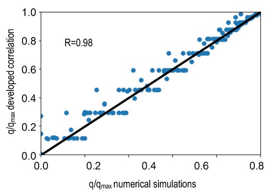 The coefficient of correlation represented in Figure 7 demonstrates that the variable is highly correlated, so the modified correlation is statistically valid. To ensure that the correlation is physically valid, the signs (negative or positive) of the coefficient are related to the effect of the Fishbone well configuration parameters on the flow rate increase or decrease, which was added to the developed algorithm with possible intervals for each coefficient to account for the physical significance of the problem.