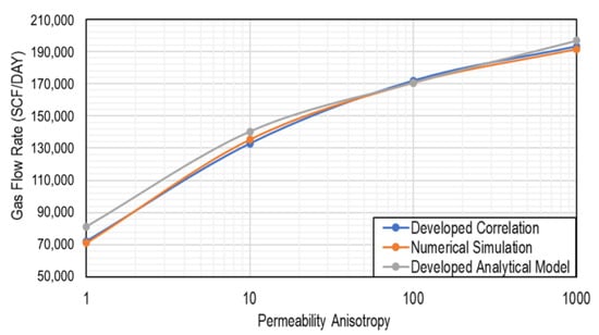 To validate the results, a comparison between the numerical simulation, modified empirical correlation, and modified analytical model flow rates was conducted. This was carried out by varying the number of the branches, length of the branches, anisotropy, and the distance between these branches.