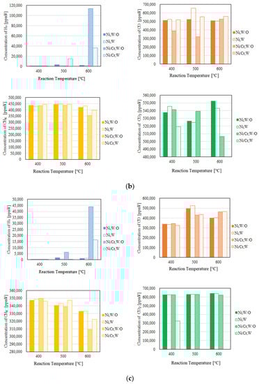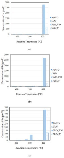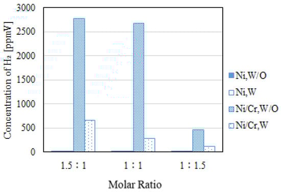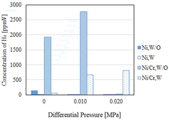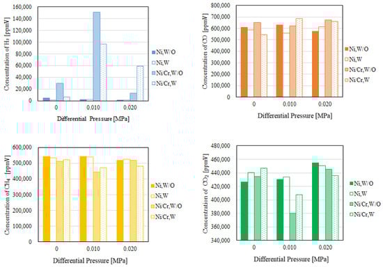 - The concentrations of H2 using a Ni/Cr catalyst in the reaction chamber and the sweep chamber without a sweep gas are higher than those with a sweep gas at the differential pressure of 0.010 MPa, while the concentrations of H2 using a Ni/Cr catalyst in the reaction chamber and the sweep chamber with a sweep gas are higher than those without a sweep gas at the differential pressure of 0.020 MPa.