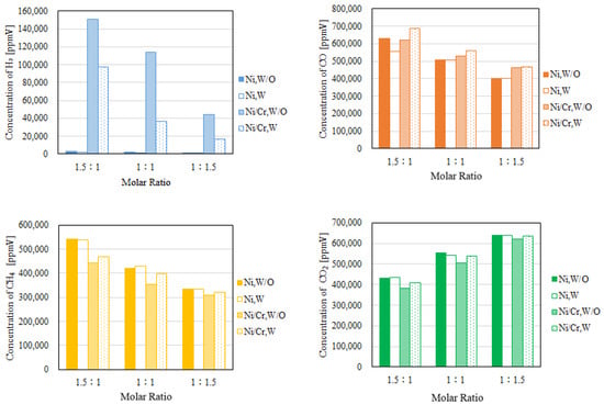 | Molar ratio of supplied CH4:CO2 (Flow rate of CH4 and CO2 (NL/min)) | 1.5:1, 1:1, and 1:1.5 (1.088:0.725, 0.725:0.725, and 0.725:1.088) |