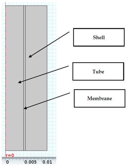 The boundary conditions at the interface at the membrane/shell section are provided by Equation (9) [,]. The H2S concentration incoming to the extraction system is 1000 mol/m3 (see Equation (10)). The flow velocity inside the tube section is 0.5 m/s (see Equation (11)).