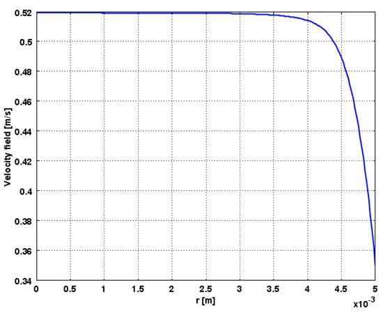According to Figure 3, the numerical errors decreased from 1 to 1·10−3. Figure 4 provides the velocity profile inside the tube section.
