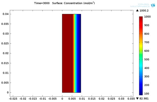 Figure 4 shows that the flow inside the tube section is a fully developed turbulent velocity profile []. Figure 5 provides a two-dimensional (2D) plot of the hydrogen sulfide concentration profile at t = 3000 s.