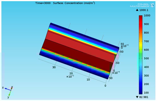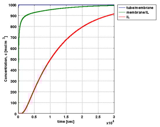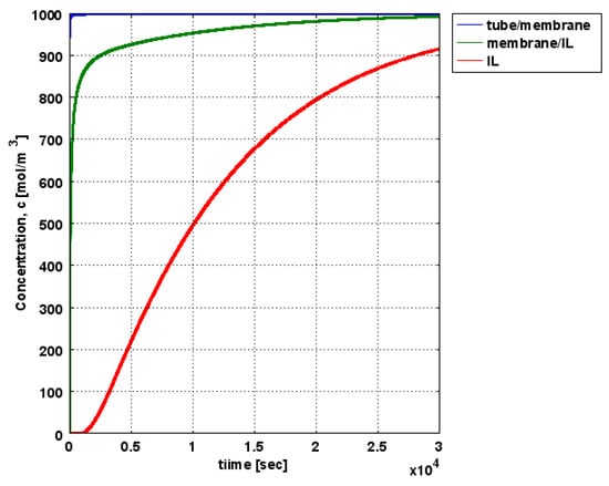 It can be seen from Figure 7 that the H2S is almost completely absorbed by the 1-ethyl-3-methylimidazolium (emim)-based ionic liquids with a bis-(trifluoromethyl) sulfonylimide (NTf2) anion after a time period of 30,000 s. This is a function of the diffusion coefficients of the H2S inside the membrane and the shell sections. Figure 8 provides the instantaneous H2S concentrations at the tube/GO membrane interface, at the membrane/shell interface and at the edge of the shell section inside the extraction system (14,832 elements).