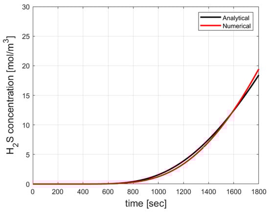 As can be seen from Figure 9, the analytical results are similar to the numerical results for short time periods. It should be noted that experimental results for this hydrogen sulfide extraction system have not been found. However, a similar model was recently developed for carbon-capture purposes []. The numerical results obtained for this similar system were favorably compared with the research work written by Sohaib et al. [].