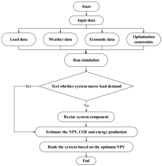 We used the HOMER software suite, known for its thorough examination of renewable energy systems, to conduct a detailed assessment including techno-economic evaluation and environmental impact analysis. We utilized an optimization technique to determine the most feasible system configuration [58]. The optimization process, including economic and environmental metrics, is visually summarized in Figure 2.