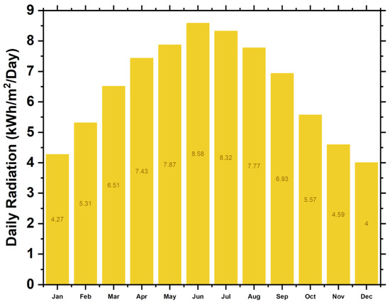 In NEOM, KSA, the PV potential is approximately 6.14 kWh/m2/day. The highest solar irradiance is in June, while the lowest is in December. The system can generate the highest solar energy in June and the lowest in December. The solar potential of the site is presented in Figure 4.