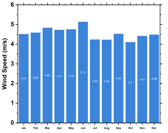 where indicates the air density, indicates the of a wind turbine, and represents the wind resource at the Neom location that exhibits significant potential for power generation. With a yearly average wind speed of 4.72 m/s on a scaled basis, the site demonstrates a viable capacity for harnessing wind power. Seasonal variations in wind speed are observed, with the highest speeds occurring in July and the lowest in October. A visual representation of the wind potential can be found in Figure 6.