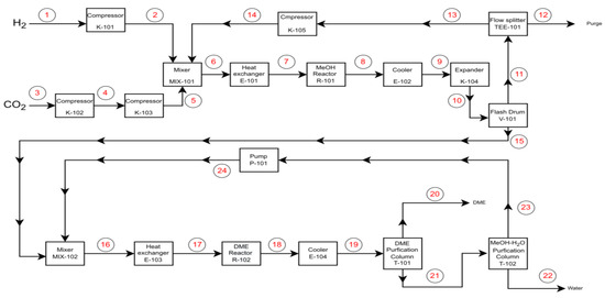 - Wu, T.-W.; Chien, I.-L. A Novel Energy-Efficient Process of Converting CO2 to Dimethyl Ether with Techno-Economic and Environmental Evaluation. Chem. Eng. Res. Des. 2022, 177, 1–12. [Google Scholar] [CrossRef]