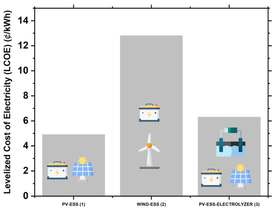 The primary aim of this study is to identify an energy system configuration that minimizes GHG emissions and maximizes the renewable fraction (RF), with RF quantified by Equation (15) [61]. We evaluate three scenarios for each energy system—photovoltaic and wind—with and without the integration of battery and fuel cell storage, as illustrated in Figure 3 [61]. This comparative analysis seeks to determine the most cost-effective and reliable energy supply configuration for the Neom region.