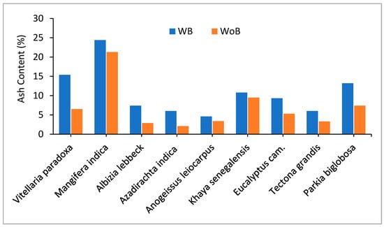 The ash content was observed to vary with the presence of bark as the samples without bark depict lower ash levels compared with those with bark (Figure 2). This shows that, irrespective of the wood species, ash content increases with an increase in the quantity of bark. Moreover, because the content of ash depicts the slagging nature of the wood during combustion, the lower the ash content, the better the heating value [37]. Overall, an ash content of less than 4% is generally preferred as it reduces slagging potential [38,39]. However, when the woods have been carbonized into charcoal, an ash content of up to 8% is acceptable [38]. While ash content can go relatively high in other solid fuels, a very low ash content (0.5–2.0%) is required for wood pellets. This implies that wood species having ash content above the stated range are not suitable for pelleting. If they must be used, then pretreatment measures such as carbonization or the use of additives could be employed to reduce the content of ash. Overall, Azadirachta indica, Albizia lebbeck, Tectona grandis, and Anogeissus leiocarpus, all without bark, yielded the best ash contents of 2.1%, 2.9%, 3.3%, and 3.4%, respectively.