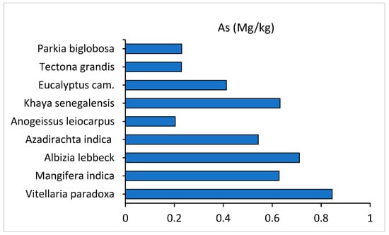 Figure 3, Figure 4 and Figure 5 show the result of heavy metals in the wood samples. Heavy metals in fuels significantly affect human health and the environment [19]. Hence, the content must be considerably low and in conformity with the set limits to make the species safe for use as fuel. Figure 3 shows the content of arsenic in the nine wood species. The values obtained are between 0.204 mg/kg for Anogeissus leiocarpus and 0.845 mg/kg for Vitellaria paradoxa. The values recorded meet the limit of ENplus [22] and ISO 17225-2 [24] (≤1 mg/kg).
