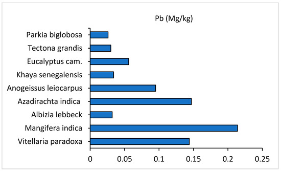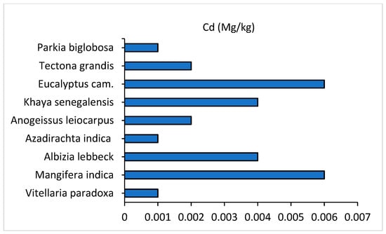 Figure 4 shows the content of cadmium in the samples. The values recorded are between 0.001 mg/kg for Parkia biglobosa, Azadirachta indica, and Vitellaria paradoxa and 0.006 mg/kg for Mangifera indica and Eucalyptus cam. Overall, the content of Cd in all the samples conforms with the ENplus [22] and ISO 17225-2 [24] standards (≤0.5 mg/kg).