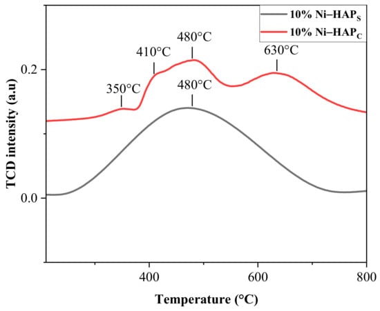 The TPR analysis, as illustrated in Figure 7, was conducted for both freshly calcined catalysts. For the catalyst supported on HAPc, a minor reduction peak was observed around 350 °C, associated with the reduction in surface oxygen species present on the catalyst []. The reduction peaks of NiO are depicted as two overlapping peaks within the temperature range of 400–650 °C. These peaks, occurring at approximately 410 and 480 °C, are attributed to the reduction of NiO particles that have a strong interaction with HAP. The third peak may be attributed to the reduction of Ni2+ species that had been incorporated into the HAP support, replacing Ca2+ ions []. Regarding the catalyst supported on HAPS, a single peak was observed at 480 °C, which is attributed to the reduction of NiO particles [].