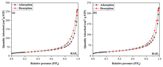 Nitrogen adsorption–desorption isotherms of (a) HAPS and (b) HAPC.