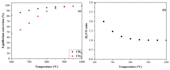 (a) Thermodynamic equilibrium conversion of CH4 and CO2 and (b) H2/CO product ratio inDRM at atmospheric pressure, with a CH4/CO2 ratio of 1.