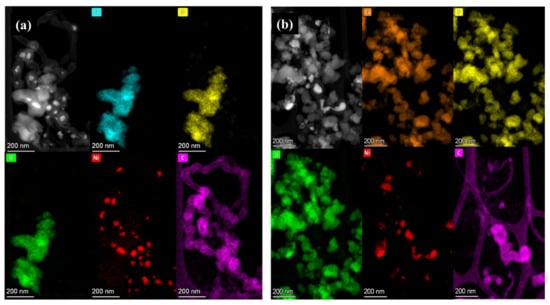 HAADF-STEM-EDX images of (a) the spent 10% Ni-HAPC and (b) the spent 10% Ni-HAPS.