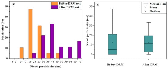 (a) Particle size distribution and (b) standard deviation before and after the DRM test for 10% Ni-HAPS.