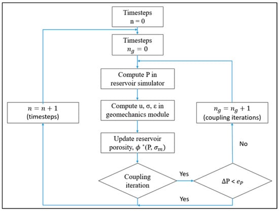The iterative coupled approach is employed to solve the fluid flow and rock deformation equations. This approach is chosen for its reliability and efficiency []. The steps involved in the iterative coupling technique are as follows: (1) Initial pressure is calculated using the reservoir flow simulator at a specified timestep; (2) pressure is transmitted to the geomechanics simulator to calculate displacement, strain and stress; (3) reservoir porosity, influenced by pressure and stress, is updated using volumetric strain. The updated porosity is used to recompute reservoir pressure. (4) The recalculated pressure is sent back to the geomechanics simulator for updated deformation calculations. The process iterates until a predetermined tolerance is achieved [,]. The iterative coupling approach is depicted in Figure 1, providing a concise summary of its diagram.