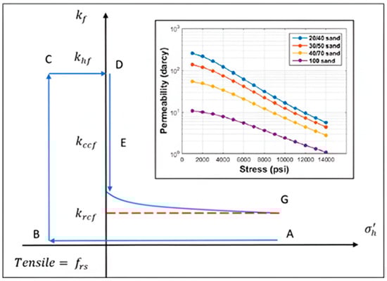 The modified Barton–Bandis model (1983) [] is used to determine fracture permeability based on closure stress. The hydraulic fracturing process is described (Figure 2) as follows: