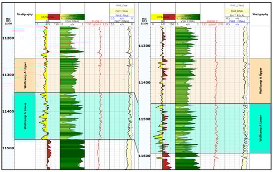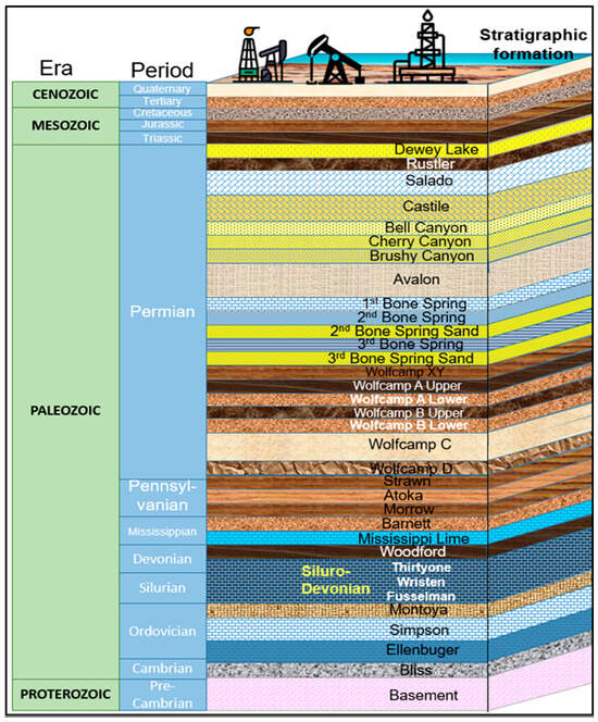 The majority of the present drilling operations in the Delaware and Midland Basins are focused on the Upper Wolfcamp, named the A and B formations. These layers are characterized by a higher abundance of natural gas and more mature phases of hydrocarbon yield compared to the Lower Wolfcamp C and D reservoirs []. On top of that, the Wolfcamp A formation consists of alternating layers of shale, siltstone, sandstone and carbonate rocks (Figure 5). The thin interbeds of sandstones and limestones within the shales can act as storage units for hydrocarbons. However, the tight nature of these rocks makes it difficult to conventionally extract oil and gas from them.