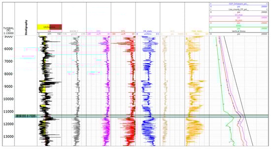 In a recent paper, Bui et al. [] constructed a detailed methodology and equations to estimate the petrophysical parameters and develop a 1D mechanical earth model for the Third Bonespring Sand in the Delaware basin. This study continues to use the same approach and formulas to calculate essential petrophysical elements for the Wolfcamp A formation at Lea County, such as shale volume and total and effective porosities. The findings show that the average shale volume is about 55%, the average total porosity is 0.09 and the effective porosity is 0.05 (Figure 6).