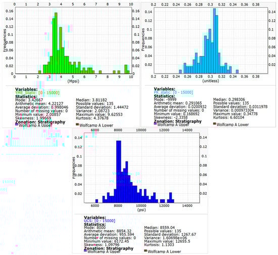The rock properties are essential in representing the mechanical behavior of the reservoir [], which is critical for hydraulic fracturing simulation. The statistical data pertaining to the Wolfcamp A formation in Figure 8 display average values of 4.2 Mpsi for static Young’s modulus, 0.29 for static Poisson ratio and 8854 psi for unconfined compressive strength (UCS).