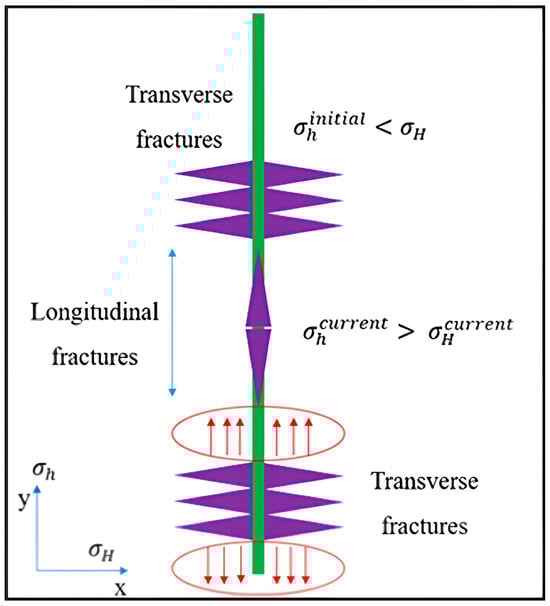 When the tensile failure criterion is met, fractures initiate and simultaneously increase the minimum horizontal stress in the adjacent zone, as illustrated in Figure 9. Previous research [,,,] describes this phenomenon using the concept of stress shadowing. This additional stress due to stress shadowing (represented as red arrows in Figure 9) increases the effective minimum horizontal stress, which, in turn, reduces the likelihood of opening the formation in the desired direction. The direction of fracture propagation may vary depending on the orientation of the existing minimum horizontal stress and the magnitude of the added stress.